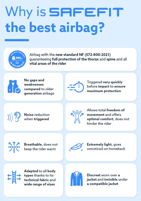Im Falle eines Sturzes garantiert die SAFEFIT Airbagweste dank ihrer ultraschnellen Auslösung vor dem Aufprall einen vollständigen Schutz der lebenswichtigen Körperbereiche (Hals, Halswirbel, Thorax, Rücken, Brustkorb, Lendenbereich, Becken und Kreuzbein).