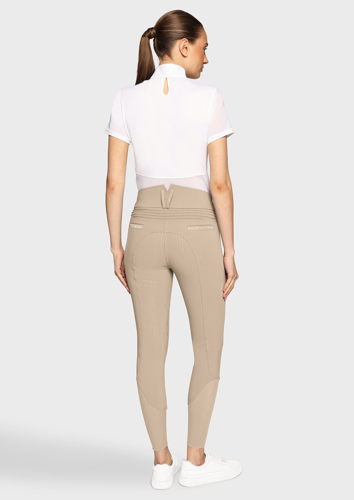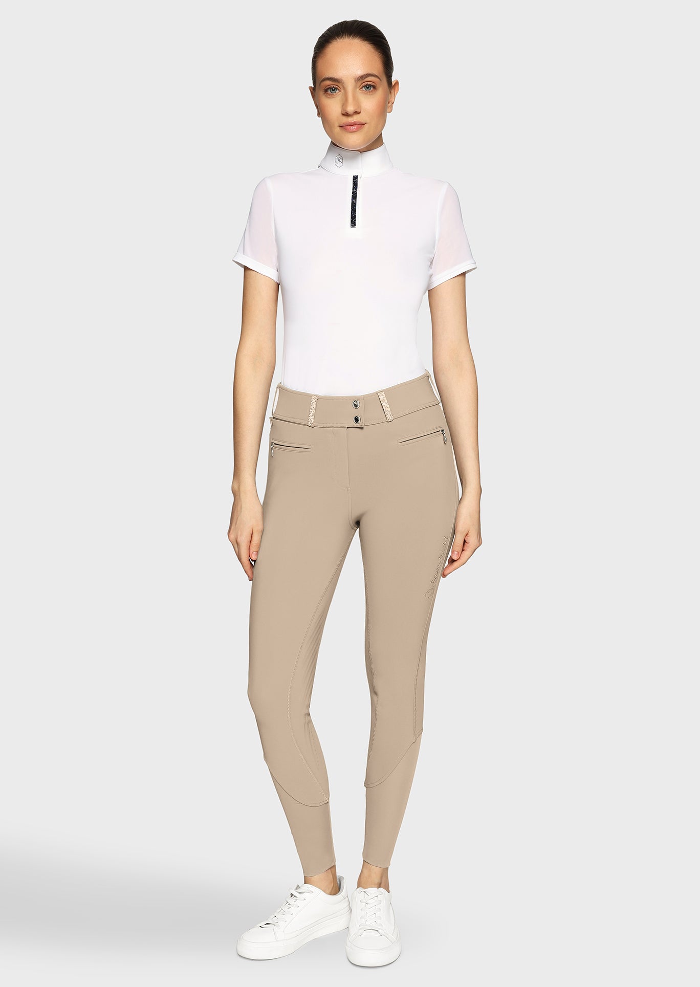 Die Reithose besteht aus hochwertigem italienischem Funktionsmaterial, das atmungsaktiv, elastisch und strapazierfähig ist. Dadurch bietet die Claranova auch bei intensiven Trainingseinheiten oder Turniertagen langanhaltenden Komfort. Luxuriöse Details wie die Swarovski Crystal Fabric Akzente an den Gürtelschlaufen und Gesäßtaschen verleihen der Reithose eine dezente, elegante Ausstrahlung. Die charakteristischen Samshield-Falten auf der Rückseite unterstreichen das raffinierte Design.