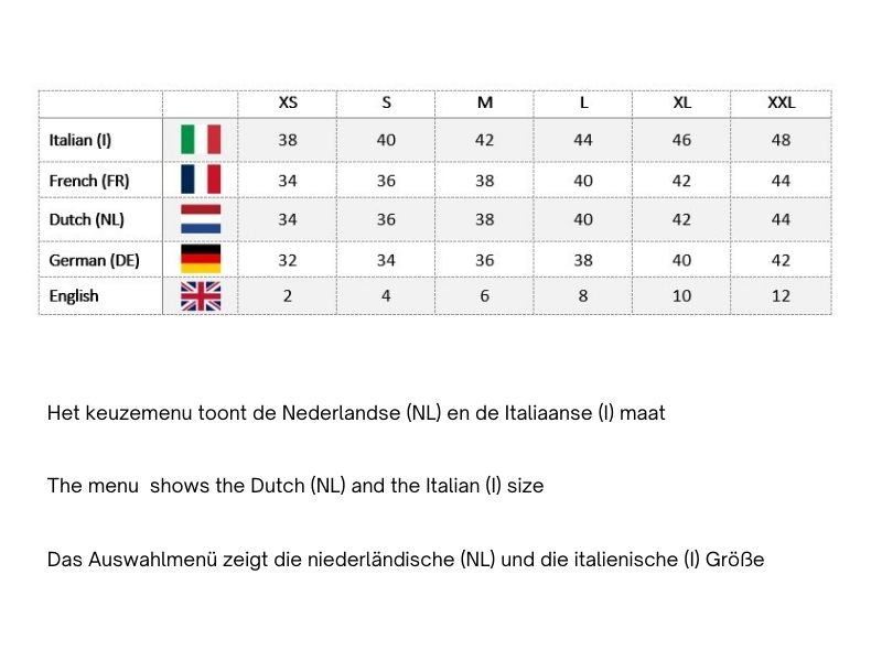 - Die italienische Größe (I) steht immer auf dem Etikett.