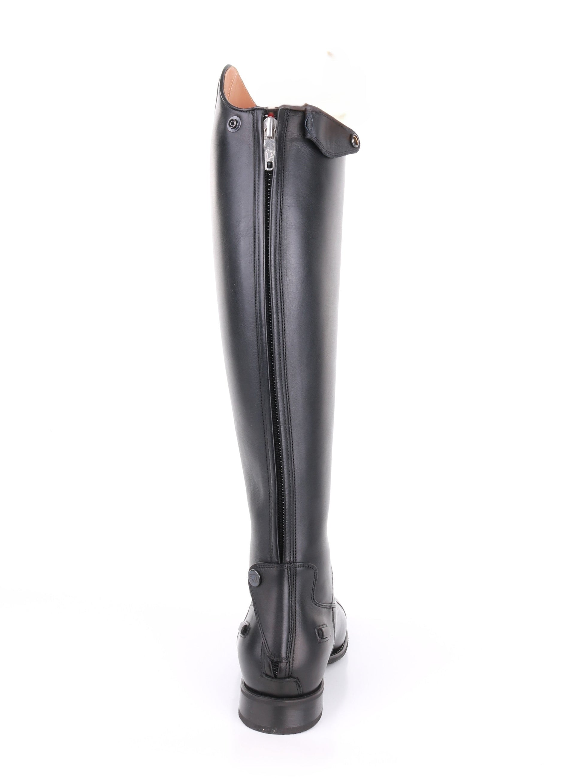 Dieser Stiefel verfügt außerdem über Schnürsenkel vorne am Spann und einen Reißverschluss an der Rückseite des Beins, der mit zwei Reißverschlussschützern (oben und unten) versehen ist. Der Reitstiefel verfügt außerdem über Sporenschützer.