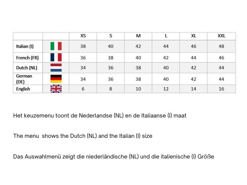 - Größen: NL34-I38, NL36-I40, NL38-I42, NL40-IT44, NL42-I46, NL44-I48