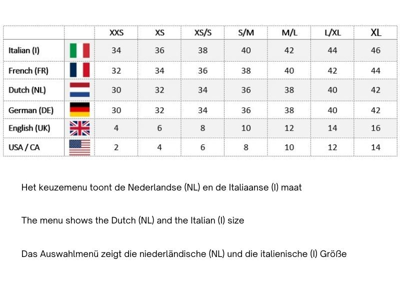 - Wichtig: Wir liefern die französische Größe. Dies ist auch die Größe auf dem Etikett in der Jacke. Die Übersetzung in andere Größen finden Sie in der Größentabelle.