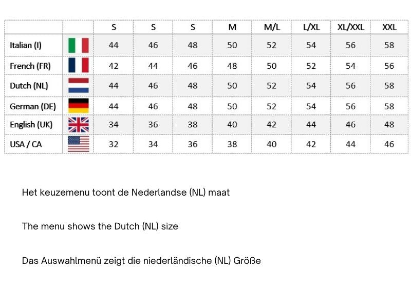 - Wichtig: Wir liefern die französische Größe. Dies ist auch die Größe auf dem Etikett in der Jacke. Die Übersetzung in andere Größen finden Sie in der Größentabelle.