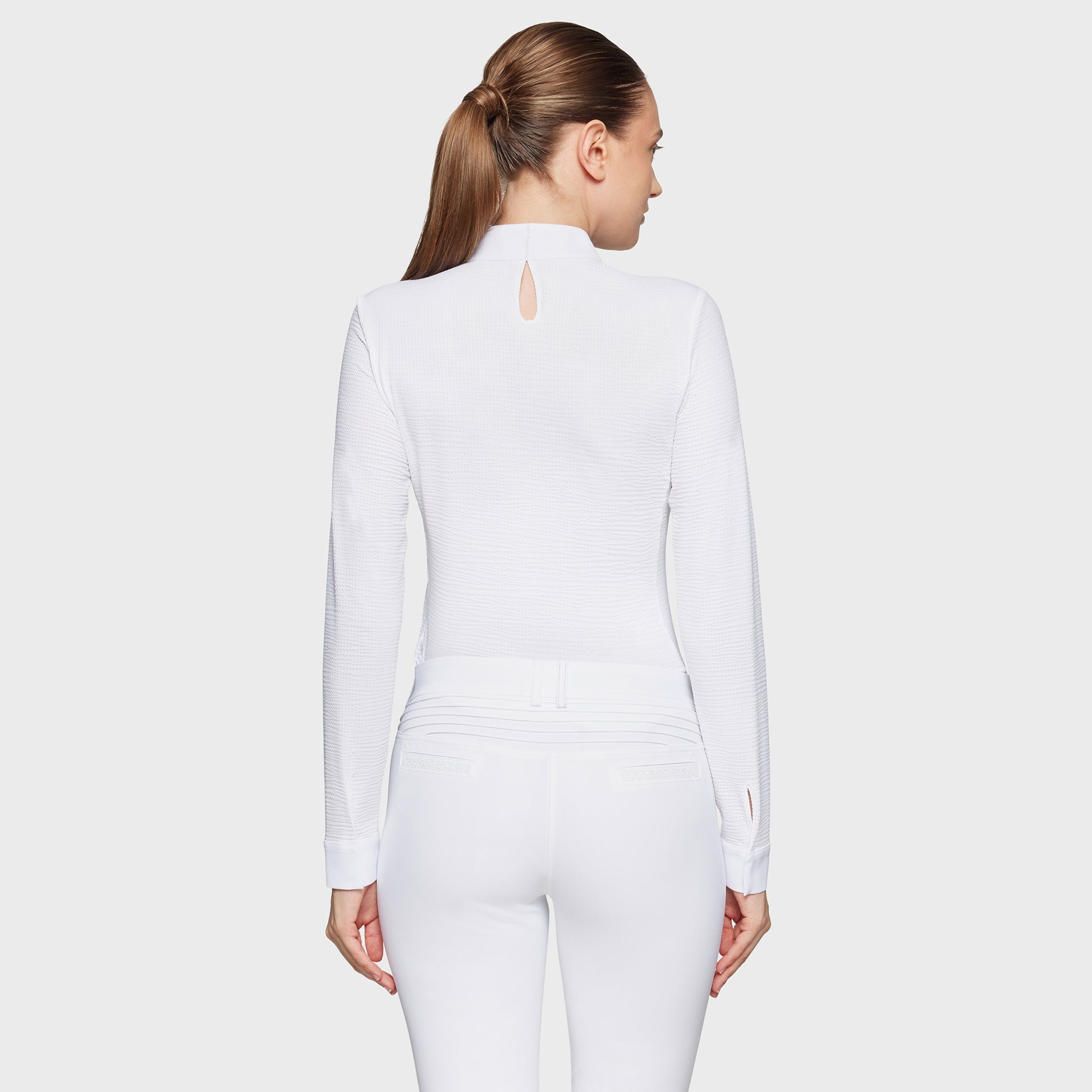 Das minimalistische Design zeichnet sich durch ein elegantes Wabenmuster und einen feinen weißen Kragen aus. Auf der Brust befindet sich das Samshield-Logo mit Swarovski®-Details, während die Rückseite des Kragens mit zusätzlichen Swarovski®-Akzenten verziert ist. Ein verdeckter Reißverschluss am Kragen und Knöpfe an den Ärmeln sorgen für ein stilvolles und praktisches Finish.